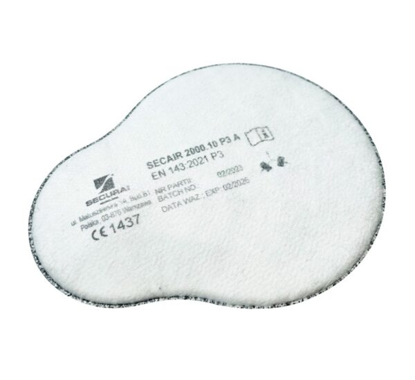 Filtry  SECAIR 2000.10 P3 A po skompletowaniu z odpowiednią dwufiltrową półmaską lub maską, chronią układ oddechowy przed aerozolami z cząstek stałych (pył, dym) i aerozolami ciekłymi (mgły), o ile stężenie fazy rozproszonej aerozolu nie przekracza wartości 30 x NDS w przypadku skompletowania z półmaską oraz 1000 x NDS w przypadku skompletowania z maską. Filtr posiada dodatkową warstwę z włókniny węglowej zapewniającej ochronę przed odorami i nieprzyjemnymi zapachami i umożliwia użytkowanie sprzętu ochronnego w atmosferze skażonej substancjami organicznymi pod warunkiem że ich stężenie nie przekracza wartości NDS.